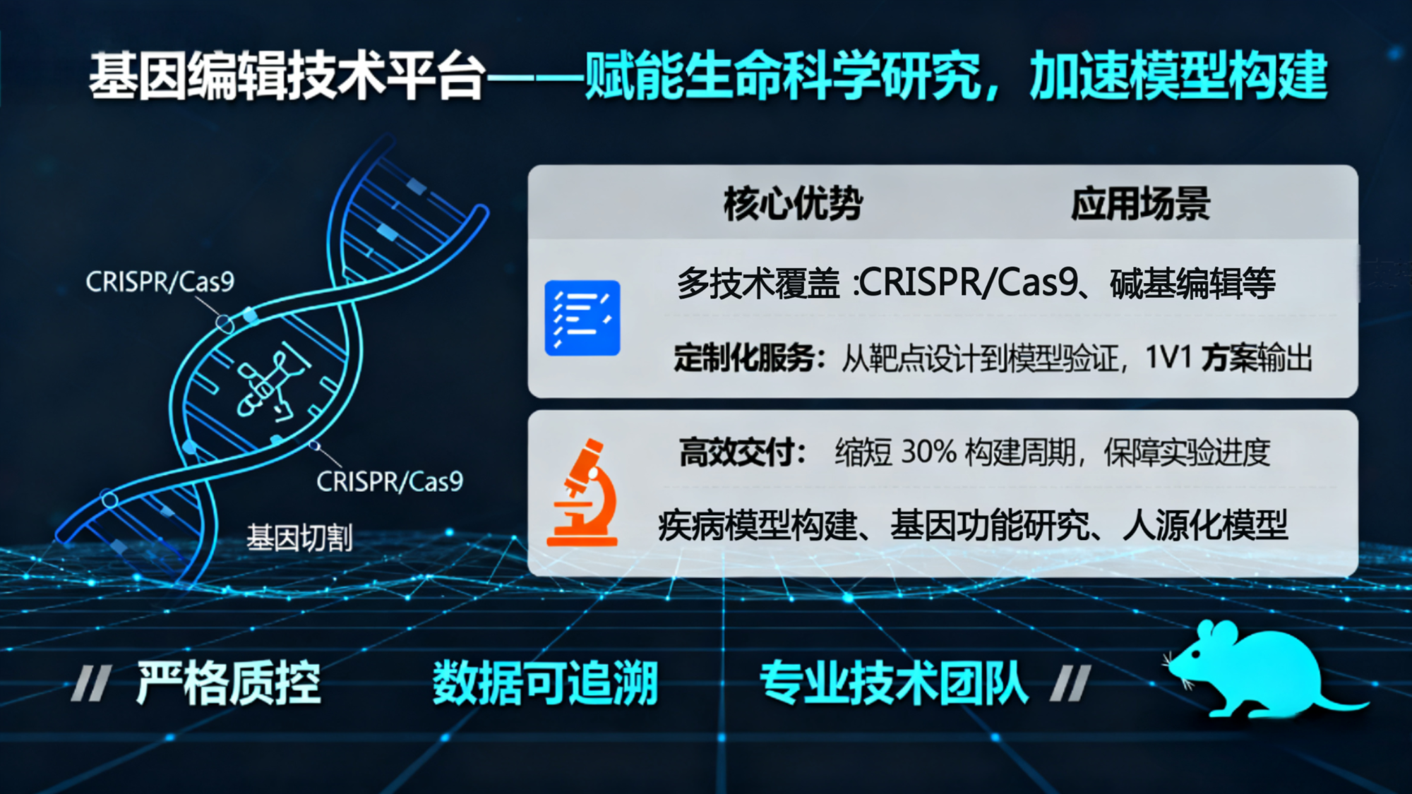基因編輯模型:提供CRISPR/Cas9等先進(jìn)基因編輯技術(shù)定制的小鼠基因敲除、敲入、點(diǎn)突變模型,精準(zhǔn)模擬人類(lèi)遺傳性疾病。